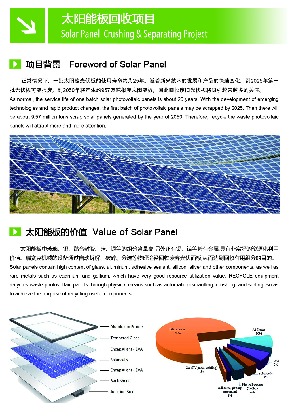 光伏板回收處理設(shè)備線的過(guò)程由機(jī)械臂抓取進(jìn)入全自動(dòng)生產(chǎn)線,僅1分鐘便完成拆解,接線盒、鋁框、EVA膠及背板、焊帶、玻璃、電池片等同步實(shí)現(xiàn)分類收集。報(bào)廢光伏組件等廢棄物的回收處置與利用成為一個(gè)新興的產(chǎn)業(yè)。光伏組件材料包含玻璃、硅、銀、銅、鋁等有價(jià)值組分,大部分物質(zhì)通過(guò)適當(dāng)回收,實(shí)現(xiàn)循環(huán)再利用,可有效緩解生態(tài)環(huán)境壓力、降低光伏全產(chǎn)業(yè)鏈能耗等指標(biāo)、節(jié)約硅和有價(jià)金屬等資源。
