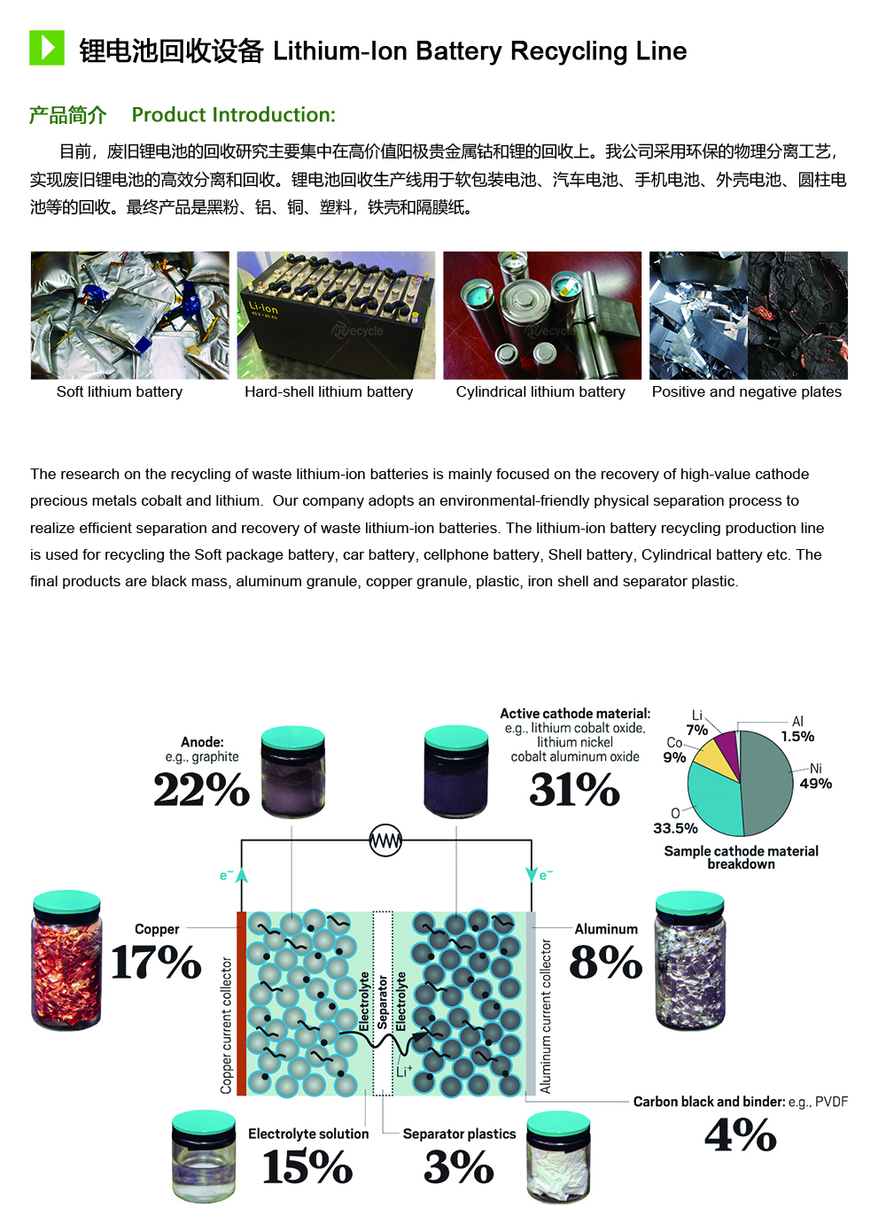 鋰電池處理分選設(shè)備?粉碎鋰電池原料,分離各組成部分及正極,負(fù)極,電解液和隔膜紙等實現(xiàn)了有價金屬富集.回收率高,綠色環(huán)保,可根據(jù)不同需求設(shè)計方案~根據(jù)客戶需求提供合資建站、設(shè)備銷售/租賃、場站運營服務(wù)、BOO、BOT等多種合作模式.可實現(xiàn)隔膜、電解液全組分回收,回收效率可達(dá)98%,回收純度可達(dá)98%!