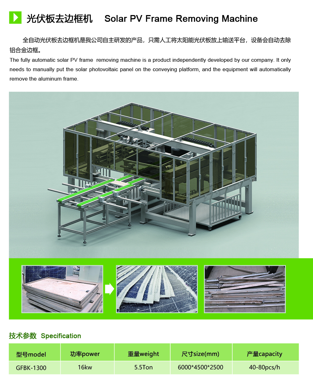 答 光伏板去邊框機的操作流程是以光伏板拆解機為背景,通過牽扯拉動力的作用,可以將鋁合