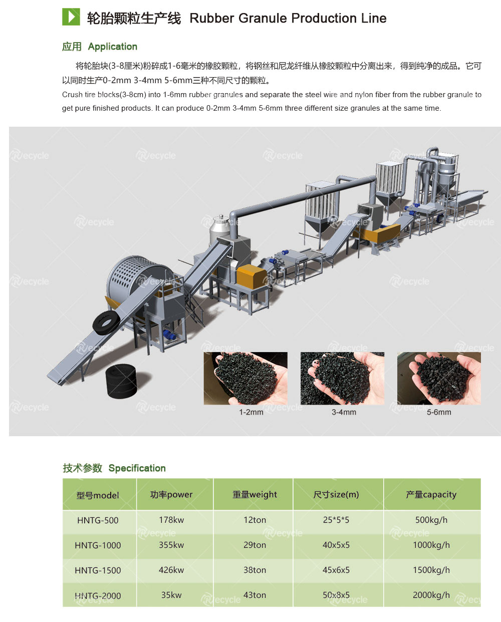 將輪胎塊(3-8厘米)粉碎成1-6毫米的橡膠顆粒,將鋼絲和尼龍纖維從橡膠顆粒中分離出來,得到純凈的成品。它可以同時生產(chǎn)0-2mm 3-4mm 5-6mm三種不同尺寸的顆粒。