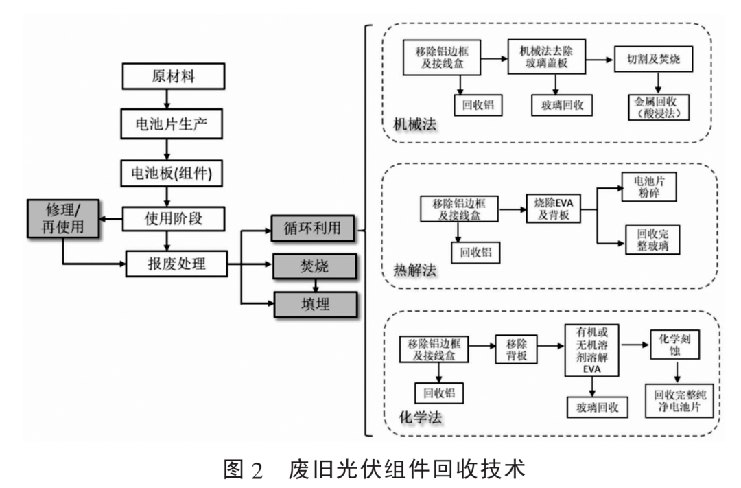 焚燒及填埋處理都不可避免地對環(huán)境造成污染, 行業(yè)尚未具備完善的回收技術(shù), 國家也未出臺相關(guān)政策和回收處理標準。目前已有的光伏電池組件回收技術(shù)大部分處于研發(fā)階段。處理時需將鋁邊框和接線盒與主體部位分離,組件主體則可通過熱分解法、化學法以及機械法進行回收處理 ,圖 2廢舊光伏組件回收技術(shù)。